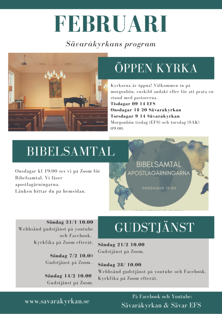 Programmet i Februari28 jan. 20211 min läsningUppdaterat: 24 okt. 2021Utöver detta har Sävaråkyrkan även årsmöte 20/2 kl 18.00